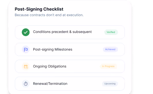 Manage your entire contract lifecycle in one centralized workflow. No scattered files, lost versions, or missed obligations.